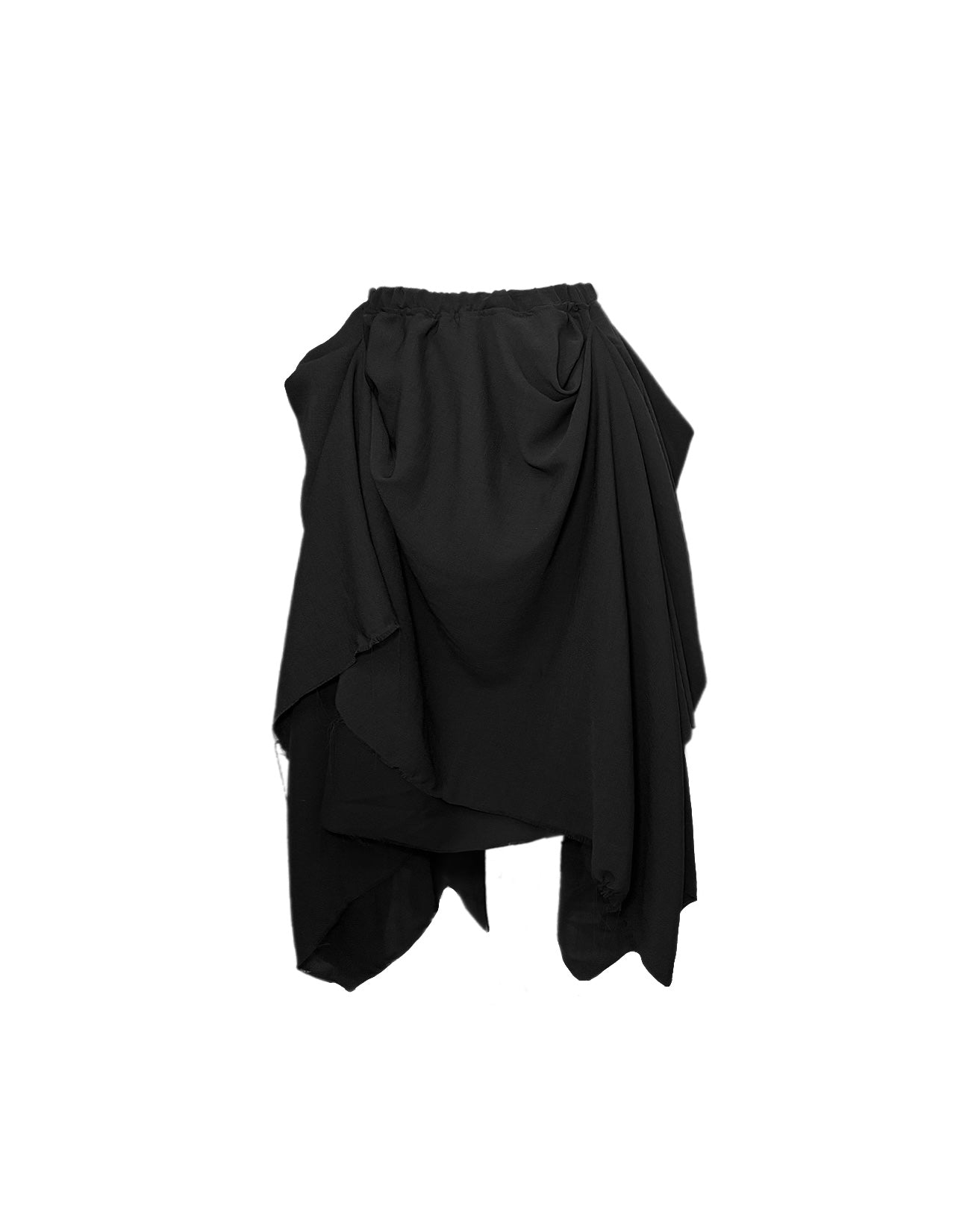 The CHIFFON RAW DRAPED SKIRT features a layered appearance to emphasise its asymmetry. Made from lightweight chiffon and powder touch crepe, it allows flow and ease of wear. The hems are left raw as a part of the collection.